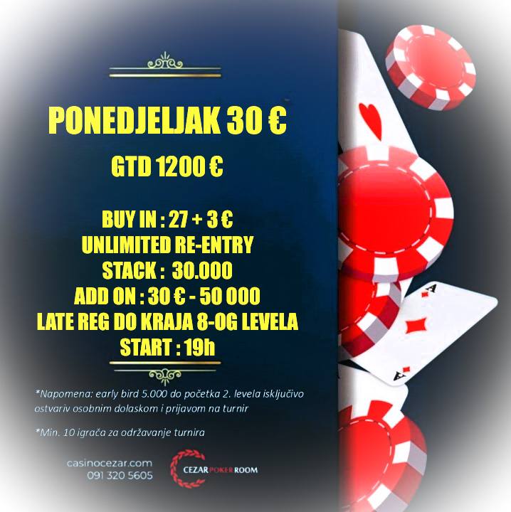 Buy-in 30€, start stack 40k + 10k Early birds, unl re-entry 30€ (40k), add-on 40€ (80k). Late reg 10 lvl. 3000€ GTD